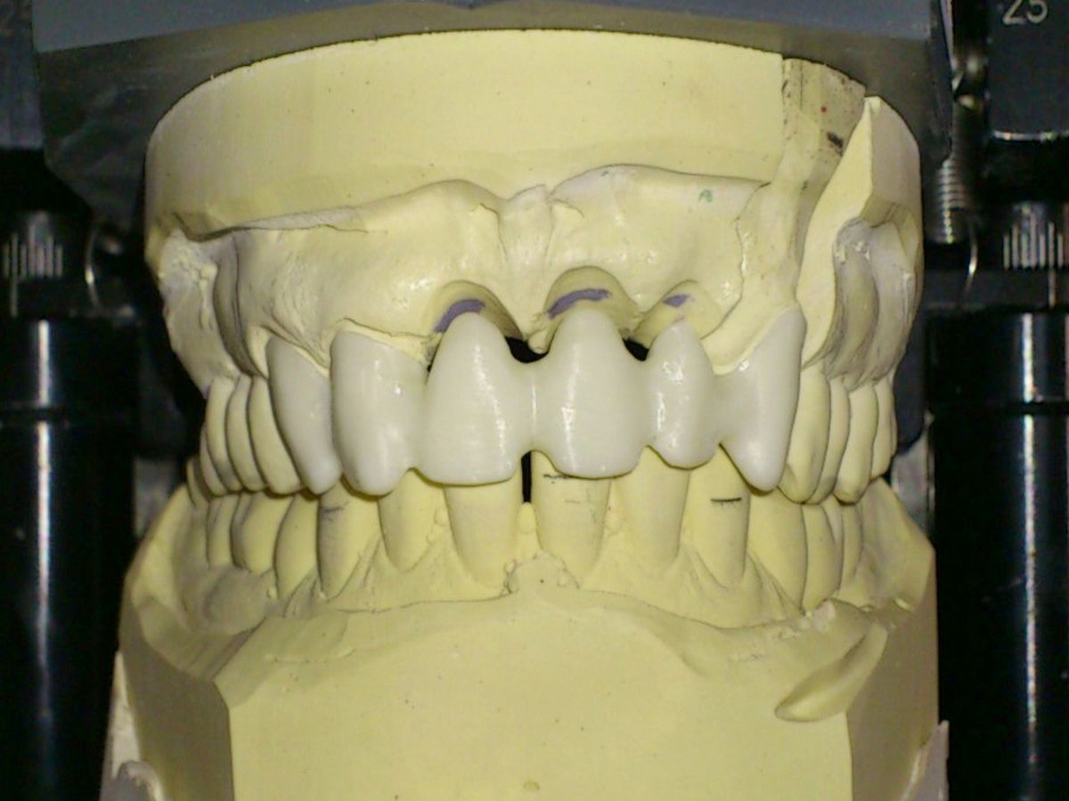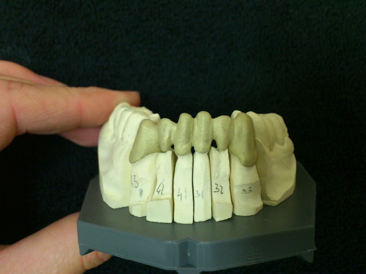 Staverdent modelleert de opbouw in wasmodulatie en zet het om in de gewenste legering en werkt de opbouw met stift (ook nasteekbare) zorgvuldig uit.